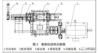 单机架可逆式冷轧机组卷取机主要由胀缩卷筒、减速器、传动电机、推卷装置、压辊装置以及活动外支撑等组成,其主要结构如图 1 所示。